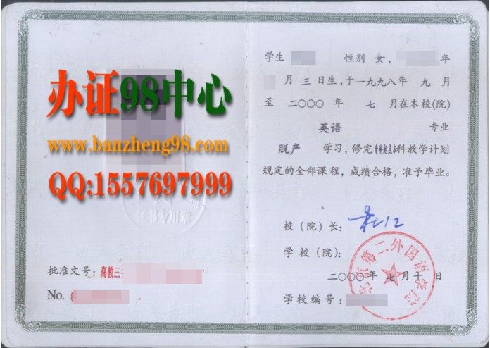 【 办证98中心专业办理提供】 北京第二外国语学院2000年成人脱产英语专业专升本毕业证样本: