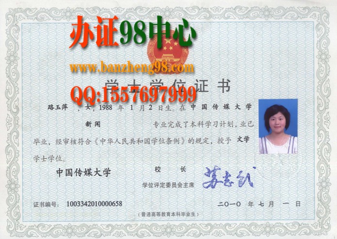 【 办证98中心提供】中国传媒大学2010年新闻专业文学学士学位证样本: