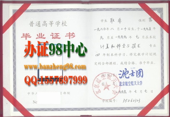【 办证98中心专业办理提供】 北京航空航天大学1999年老版本本科毕业证样本