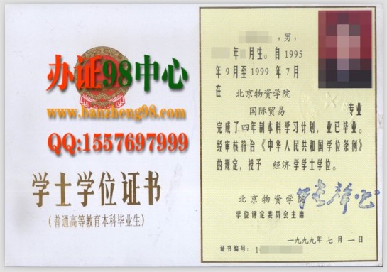 【办证98中心】北京办学位证怎么办? 北京哪里可以办学位证?北京办学位证需要多少钱? 北京办学位证:北京物资学院1999年国际贸易专业本科经济学学士学位证样本