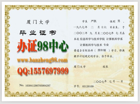 【办证98厦门办证中心】厦门办真实本科毕业证 厦门大学信息科学与技术学院计算机科学系2007年本科毕业证样本