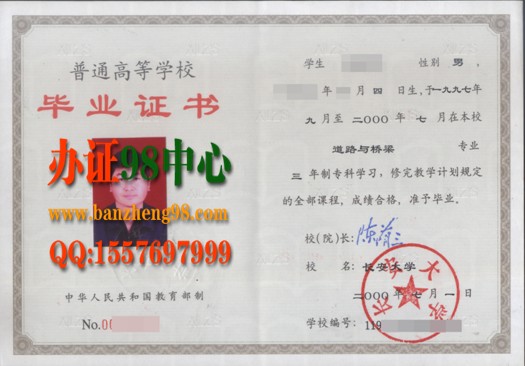 【办证98长安办证中心】长安办本科毕业证 长安办大专毕业证 |长安大学道路与桥梁专业专科2000年毕业证样本