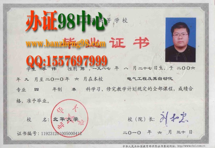 【 办证98中心专业办理提供】 北华大学2010年电气工程及其自动化本科毕业证样本