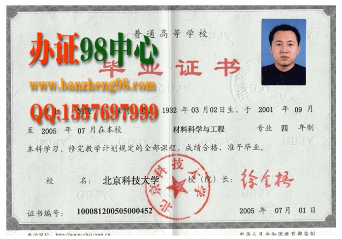 办证98中心:北京科技大学2005年材料科学与工程专业本科毕业证样本