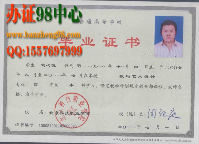 办证:北京办真实毕业证办理北京科技职业学院2011年数码艺术设计专业本科毕业证样本