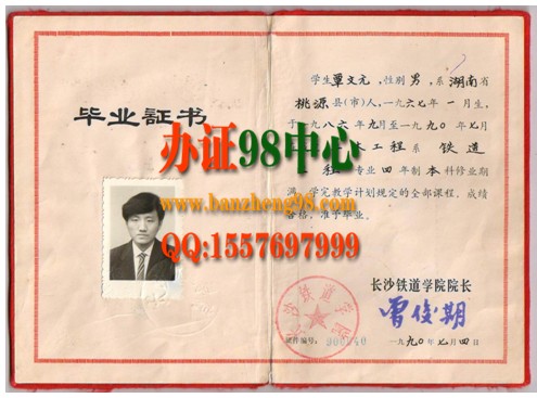 【办证98长沙办毕业证服务中心】长沙铁道学院毕业证怎么办理,在哪里可以办理?长沙办证提供长沙铁道学院1990年土木工程系铁道工程专业本科毕业证样本