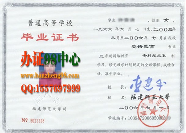 办证98福州办证中心独家冠名提供:福建师范大学专升本毕业证样本,福建师范大学成人脱产专科毕业证样本