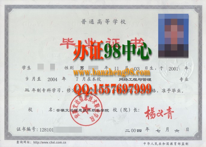 办证98提供:安徽文达信息技术职业学院2004年网络工程与管理专业专科毕业证样本