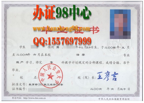 办证98服务中心提供:中国人民公安大学2006年成人脱产学习专科毕业证样本校长王彦吉