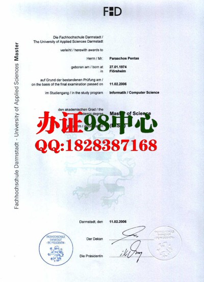 【德国办证】 德国办毕业证 德国文凭办理 德国达姆施塔特应用科技学院文凭样本 Hochschule Darmstadt, University of Applied Sciences