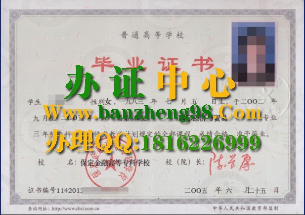 办证网办理与提供:保定金融高等专科学校毕业证样本