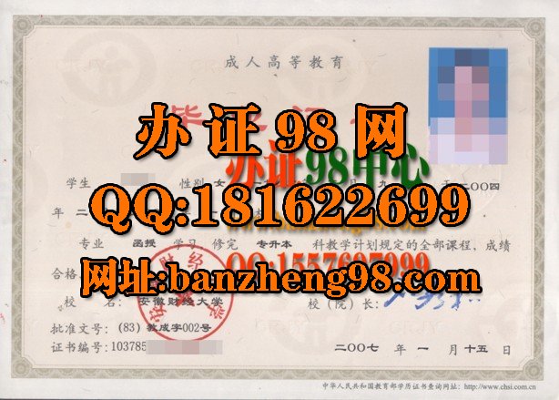 办证98中心安徽财经大学2007年成教专升本函授毕业证样本