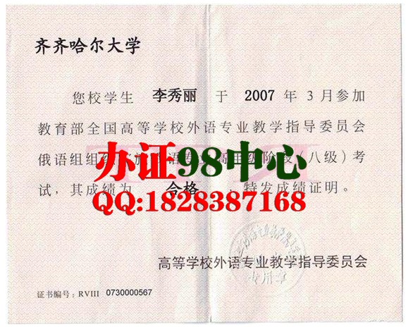【齐齐哈尔办证-办证网】齐齐哈尔办俄语专八证 齐齐哈尔办齐齐哈尔大学俄语专业八级证书 齐齐哈尔大学2007年俄语专业八级证书样本