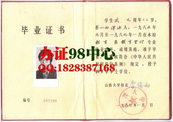 【太原办证】太原办老版毕业证 太原办山西大学80年代毕业证 山西大学1989年教育系教育管理专业老毕业证样本