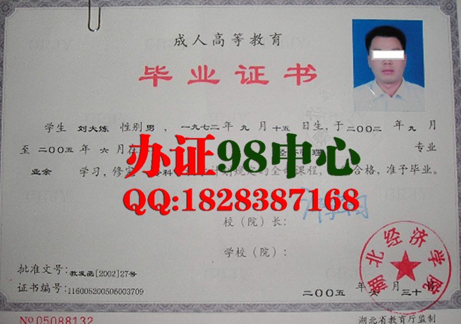 武汉办成人业余大专毕业证 湖北经济学院05年成人业余大专毕业证
