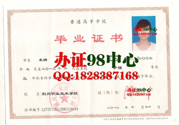 【武汉办证】武汉办毕业证 武汉办大专毕业证 武汉办真实大专毕业证 荆州职业技术学院2012年大专毕业证样本