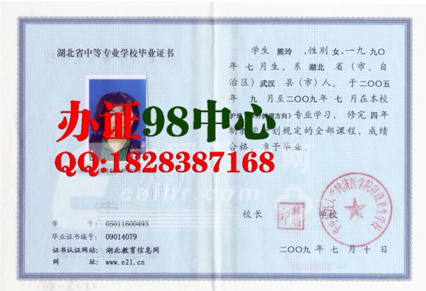 【武汉办证】武汉办中专毕业证 武汉办护理(涉外护理方向)专业中专毕业证 华中科技大学同济医学院附设卫生学校2009年中专毕业证样本