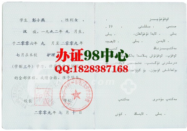【乌鲁木齐办证】新疆办毕业证 新疆办证 新疆办护理学专业毕业证 乌鲁木齐办石河子大学真实毕业证 石河子大学护士学校2009年原版带新疆语毕业证样本