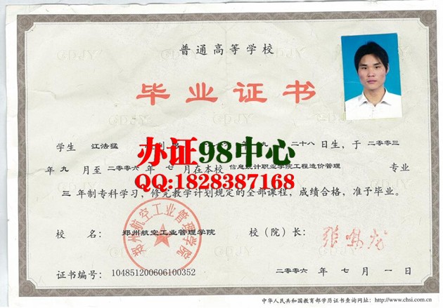 【郑州办证】郑州办真实大专毕业证 郑州办郑州航空工业管理学院真实大专毕业证 郑州航空工业管理学院2006年信息统计职业学院工程造价管理专业专科毕业证样本
